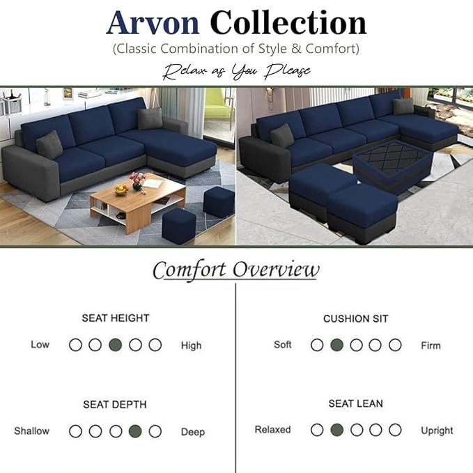 Design & Material: The Arvon Sofa Set is crafted from premium materials that guarantee both durability and comfort. The fabric upholstery in a sophisticated blue and dark grey palette adds a touch of modern elegance to any living space. The set includes a spacious 3-seater sofa and two matching puffys, perfect for additional seating or as stylish footrests.