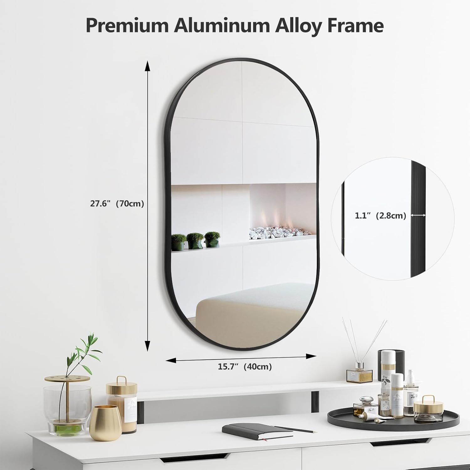 - With explosion-proof glass, our wall mounted mirror is safer for your family and you. The frame of this wall mirror is made of sturdy and rust-proof space aluminum, which is not easy to deform and damage, and also is not easy to be corroded or rusted.