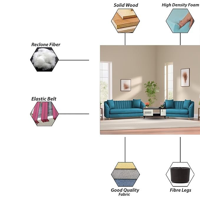 Add a touch of elegance and comfort to your living room with the Doraldo 3 + 2 Seater Sofa Set in Turquoise. This premium fabric sofa set, comprising a 3-seater and a 2-seater, is meticulously crafted to combine style, durability, and comfort, making it a perfect choice for modern living spaces. Design & Material: The Doraldo Sofa Set is constructed from high-quality solid wood, ensuring robust durability and long-lasting performance. The sofa is upholstered in luxurious premium fabric, offering a soft and inviting texture that complements the vibrant turquoise color. The design is both contemporary and timeless, making it an eye-catching addition to any living room. Comfort & Durability: Engineered for comfort, the Doraldo Sofa Set features a web suspension system for the back-rest and hand-rest, providing enhanced support and comfort. The seat construction includes webbing belt support, which not only adds to the durability of the sofa but also ensures that the high-density foam cushions maintain their shape and provide consistent comfort. Assembly: Assembly is straightforward, with detailed instructions provided by the seller. The assembly process is designed to be simple and hassle-free, so you can start enjoying your new furniture as soon as it arrives. Dimensions & Specifications: